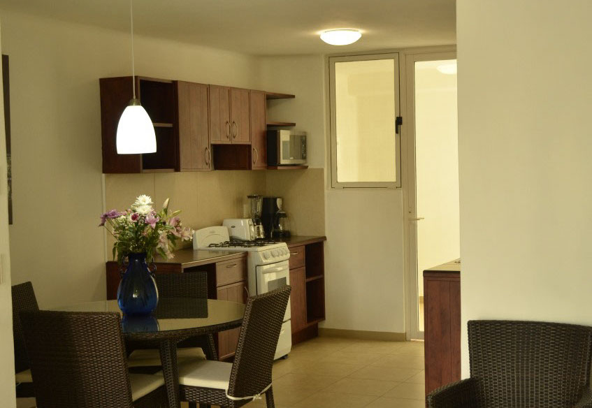 Suite de dos recámaras con terraza privada en segundo nivel (vista a la alberca) totalmente amueblada, WiFi, televisión por cable y utensilios de cocina. La recámara principal cuenta con cama queen size y la segunda con cama matrimonial, sofá cama en sala, terraza privada amueblada, aire acondicionado en sala y en cada recámara, televisión de 32 pulgadas de pantalla plana, ventiladores de techo en sala y recámaras, caja de seguridad y lavandería.